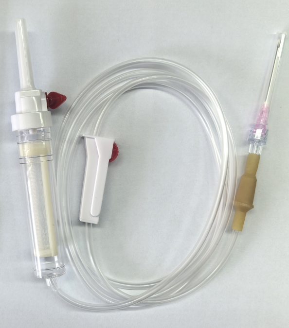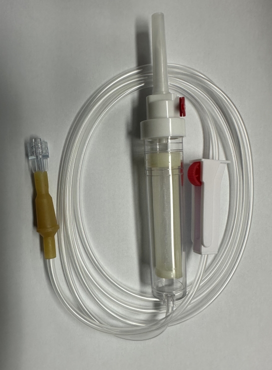 Infūzijas sistēma ar gaisa aizturēšanas un šķidruma aizturēšanas uzpildīšanas filtriem, sterila, bez injekciju adatas, ar filtru un Luer-Lock savienojumu, vieglu infūzijas šķīduma flakona korķa membrānas perforāciju nodrošinoša, asa, silikonizēta plastmasas adata; starp adatu un pilienu uztvērēju integrēts bakteriāls aizverams un atverams gaisa filtrs; pilienu kamera, caurspīdīga, ar lejasdaļā novietotu 15µm daļiņu filtru; sistēma aprīkota ar…