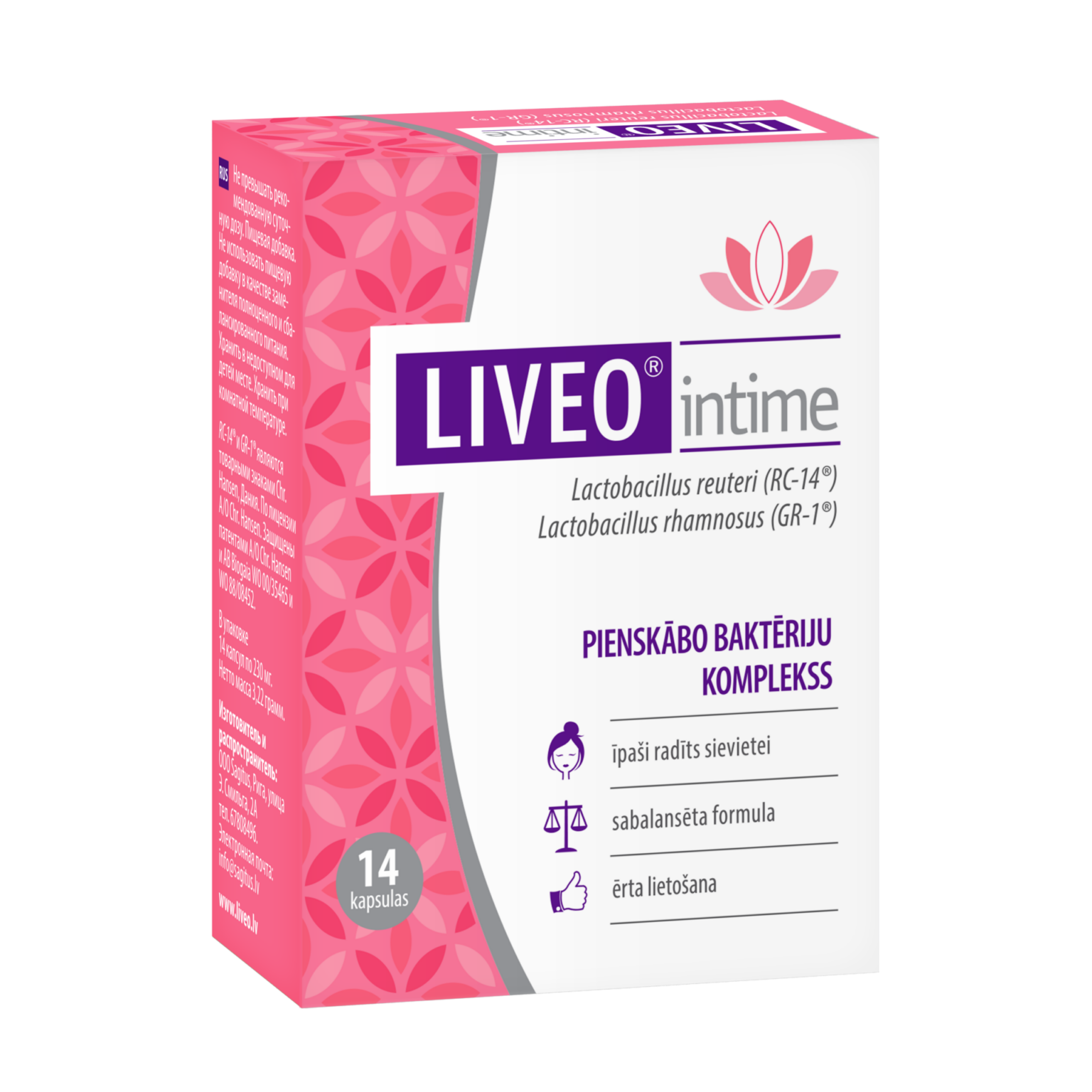 LIVEO intime ir pienskābo baktēriju komplekss sievietēm – vaginālās mikrofloras līdzsvaram. Pētījumos pierādīts, ka LIVEO intime sastāvā esošās baktērijas Lactobacillus reuteri RC-14® un Lactobacillus rhamnosus GR-1® ir efektīvs palīgs sievietes intīmajai labsajūtai.